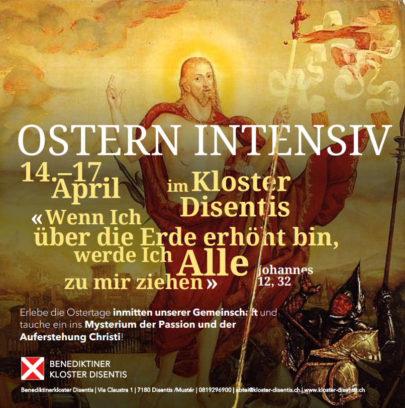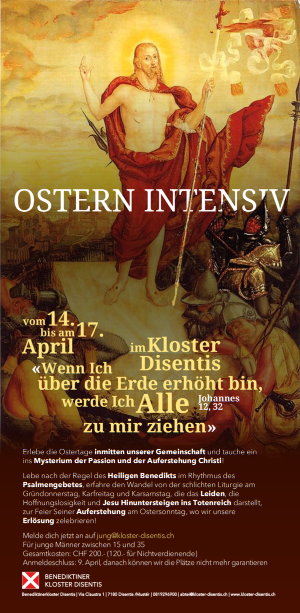 Ostern ist das grösste Fest der Christen. Die Oster-Liturgie ist entsprechend besonders und einmalig im gesamten Kirchenjahr. Im Rahmen unseres Angebotes «Ostern intensiv» für junge Männer bietet sich die Gelegenheit, die Vorbereitungen und die Feierlichkeiten gemeinsam mit den Mönchen im Kloster Disentis zu erleben und intensiv in die österliche Liturgie einzutauchen. Dabei tauschen die Gäste ihren gewohnten Alltag mit dem Alltag aus Gebet, Arbeit und Lesung hinter den Klostermauern und leben ganz in unserer Welt. Sie lernen den Lebensstil der Pater und Brüder kennen, die nach den Regeln Benedikts leben. In der langen Tradition der Benediktiner wollen wir Mönche Gott näherkommen und bemühen uns, ein gottgewolltes Leben zu führen.