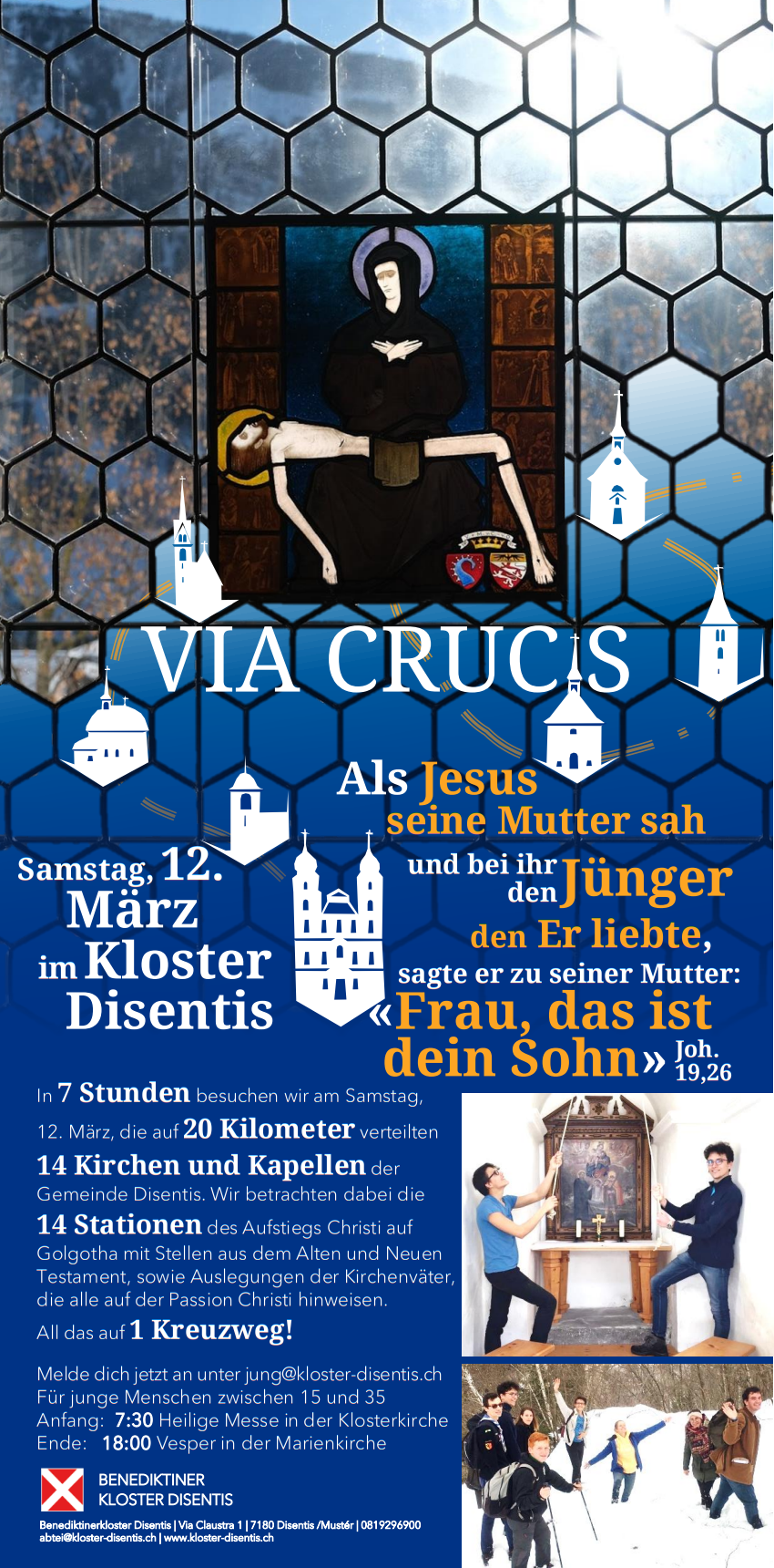 Unser nächster gemeinsamer Kreuzweg zu den 14 Kapellen und Kirchen der Gemeinde Disentis findet am 12. März statt. Das Angebot «Via Crucis» richtet sich an junge Menschen im Alter von 15 bis 35 Jahren und ist eine gute Vorbereitung auf die Osterfeierlichkeiten. Für Fragen und Anmeldungen sind wir unter jung@kloster-disentis.ch erreichbar.